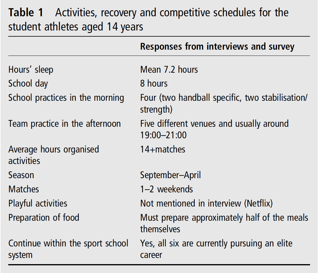 Elsa Kristiansen og Trine Stensrud undersøkte hvordan seks unge kvinnelige håndballspillere opplevde og håndterte overgangen fra barneskolen til en ungdomsskole med idrettstilbud. Resultatene viste at den store økningen i treningsvolum førte til at jentene måtte håndtere en utfordrende balanse mellom skole, idrett og fritid, mindre søvn og hvile, og alvorlige skader. Forskerene viser tydelig hvordan totalbelastningen for utøverne i studien var for høy, og at idrettsskoletilbudet forsterket denne utfordringen.