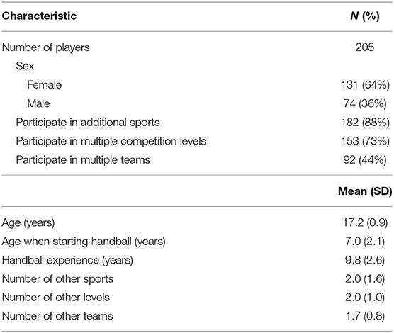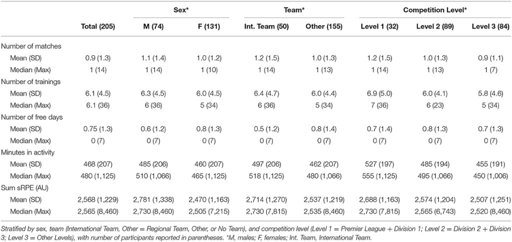 De fleste spillerne (76%) spilte U18 deltok på spillerutviklingsaktiviterer foruten aldersbestemte landslag (72%), spilte på flere nivåer (73%) og nesten halvparten (44%) spilte for flere lag. Antall kamper, antall ukentlige treninger, antall minutter i aktivitet, og belastning (målt som tid x selvopplevd belastning 0-10) varierte stort mellom spillerne. Gjennomsnittet antall kamper i uken var 0.9 ± 1.3; antall treninger 6.1 ± 4.5 og gjennomsnittlig antall fridager 0.75 ± 1.3. Det er verdt å merke seg at de fleste spillerne ikke hadde noen treningsfrie dager i uken.