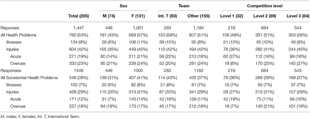 Hver spiller rapporterte i gjennomsnitt 2.3 ± 2.9 skader gjennom sesongen. Hele 53% av spillerne slet til enhver tid med skade eller sykdom, og 38% alvorlig skadet eller syk. Menn rapporterte til enhver tid signifikant færre (alvorlige) helseproblemer enn kvinnene. Spillerne som spilte eliteserie eller 1. div, og spillere som deltok i aldersbestemt landslagsaktivitet rapportere signifikant færre (alvorlige) skader enn resten. Dette kan muligens bety at de beste spillerne er de som «overlever» systemet eller at de beste spillerne blir bedre ivaretatt enn de nest beste.