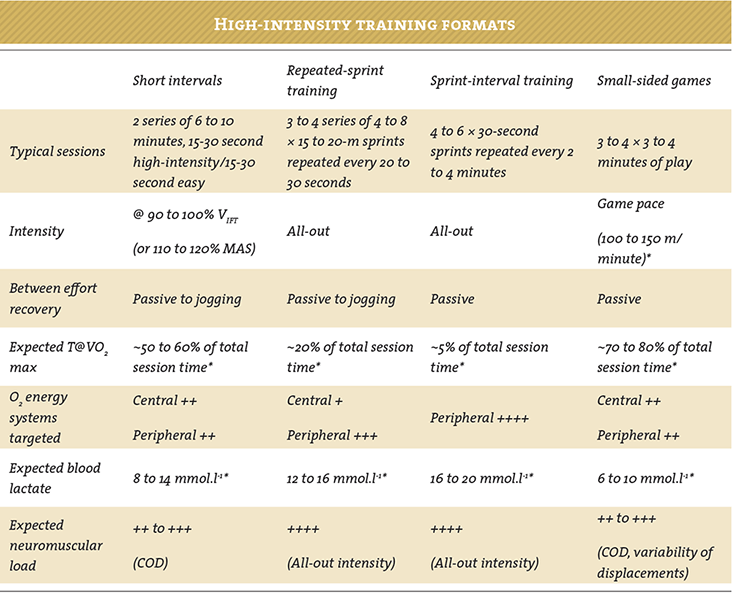 Den mest populære treningsformen for å utvikle aerobe utholdenhet er høyintensitets-intervalltrening, som har vist seg å gi betydelige forbedringer på kondisjonen. Høyintensitets-intervalltrening har tradisjonelt vært gjennomført som enten (a) langintervalltrening (1 til 4 minutter arbeidsperioder); (b) kortintervalltrening (10 til 60 sekunder arbeidsperioder); (c) sprintintervalltrening (30 sekunder maksimal innsats etterfulgt av 2 til 4 minutter passiv hvile); eller (d) repetert sprinttrening (3 til 7 sekunder sprint etterfulgt av pauser på opptil 60 sekunder). Derimot så har forskere de siste 10 årene blitt mer og mer interessert i effekten av spilltrening på kondisjon.